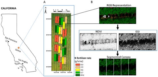 (A) Experimental site composed of 150 vines with five nitrogen application treatments at Selma, California. Each plot contained five consecutive vines in a row. Depending on the nitrogen and split application treatments assigned to the plots, the vines had received 0, 3.9, 9.6, 9.7, or 24.2 g N/vine at the time the data were collected (bloom). (B) Segmentation process of canopy pixels using excess green index (EGI) and normalized difference vegetation index (NDVI). The extent of each vine within a plot was determined based on the markers’ location, spatial resolution (~1 cm/pixel), and vines spacing (1.83 m).