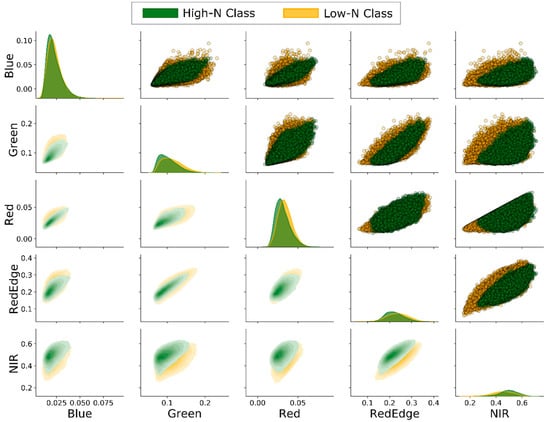 Pixels representing low-N class tend to scatter more in the feature space, indicating more variation among pixels. Alternatively, pixels of the high-N class tend to cluster with less variation, generating denser area in the scatter plots. However, the regions with a higher density per each class are not noticeable in the scatter plots due to a large number of pixels and a high degree of overlapping. Therefore, the bivariate kernel density estimate (KDE) is shown in the lower triangle of the grid in Figure 3. The bivariate KDE plots illustrate the variability of the underlying probability density function of each class across the two-dimensional feature space spanned by two bands. While the scatter plots provide information about the distribution of the pixels from the two classes, the bivariate KDE plots demonstrate the probability density of the pixels per each class—regions with higher probability density are shown with a darker color in Figure 3. Similar to the scatter plots, bivariate KDE plots indicate the positive correlation between spectral bands as the major axis of the ellipsoid in pairwise plots has a positive slope.