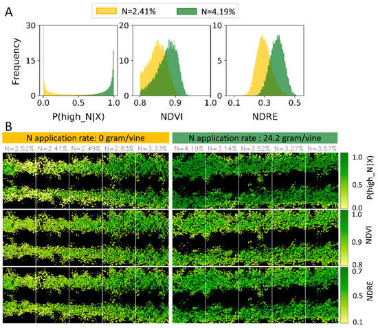 Comparing the results obtained by one of the machine learning techniques (posterior probability of the high-N class, , obtained by XGBoost) with two widely used spectral indices, normalized difference vegetation index (NDVI) and normalized difference red edge index (NDRE). (A) Histogram of for two vines with minimum and maximum nitrogen concentration among all 150 vines compared with NDVI histogram and NDRE histogram. A distinct separation exists in histogram for the pixels of vines with the two extreme nitrogen concentrations compared with NDVI and NDRE. (B) Pixel-base , NDVI, and NDRE represented with a colormap for two plots with zero, and 24.2 g of nitrogen applied per vine. Each plot contains five vines, and the nitrogen concentration measured through leaf sampling is shown at the top of each vine. obtained by XGBoost captures the spatial variability of N across the plots, offers a wider dynamic range, which is visually more appealing for human sensory comparison and is more useful in spotting hot zones suffering from low nitrogen in a vineyard.