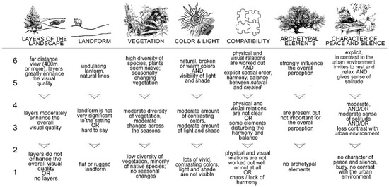Simplified Contemplative Landscape Model for built landscape evaluation with 1 to 6-point scoring scale; adapted from [22].
