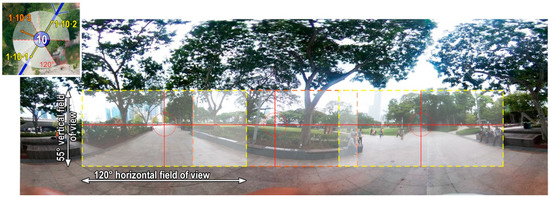 Photographic data collection took place between 1 and 30 January 2020, between 9 and 11 AM. 360° photos were taken in similar weather condition, at the shooting points pre-selected before going to the site with 20m distance between each other (Figure 2c–f). The photos were taken at 165cm above the ground, with a RICOH Theta Z1 360 Camera and pre-processed in Ricoh Theta Z1 Software UVC4K for Windows (Ricoh Company, Ltd.). Three viewpoints were extracted from each photo according to the 120° horizontal and 55° vertical limits (25% upper + 35% lower view), which corresponds to comfortable human visual field [44]. After estimating the center of vision (crossing of the horizon line and viewing direction vertical line, the crop window was set at 1920 × 880 pixels (corresponding to 120:55 ratio) (see Figure 3).