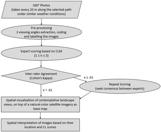 To ensure objective scoring, each of the 204 coded viewpoints was manually evaluated by three experts [45] trained in landscape architecture according to the 7 key-components of CLM. Each of these scores was then averaged among three experts and the total contemplative score (CL score) for each view was obtained. The total CL score of the whole path was derived from the average score of each assessment point. To ensure the reliability of the expert assessment, the inter-rater agreement was calculated using the Cohen’s kappa measure [46].
