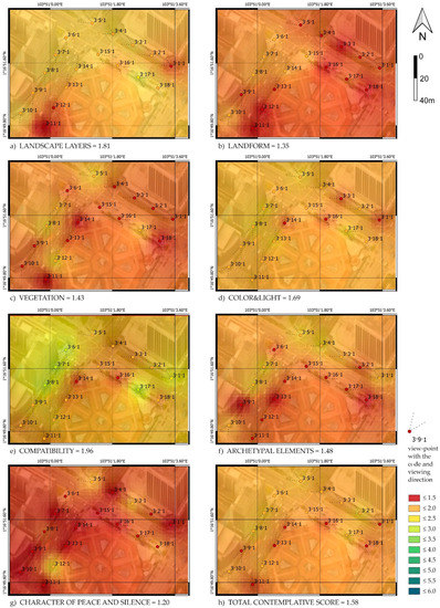 The contemplative landscape model (CLM) developed by Olszewska-Guizzo provides the possibility to systematically assess the quality of landscape design, recognizing that each landscape view/scene has some contemplative value, determined by the aggregation of seven key-features, including: landscape layers, landform, vegetation, color & light, compatibility, archetypal elements, and the character of peace and silence [21]. Figure 1 illustrates the CLM with corresponding scores on a 1–6-point Likert scale and brief descriptions of each feature. CLM was developed and operationalized to enable expert-based evaluation of the contemplative value of various views and scenes with special consideration of the urban context, including urban green space (UGS) as built elements are important variables in the compatibility and character of peace and silence categories CLM is, to the best of our knowledge, the only visual assessment tool employing such a nuanced approach to landscape quality assessment, and which has been operationalised in order to be used in mental health research.
