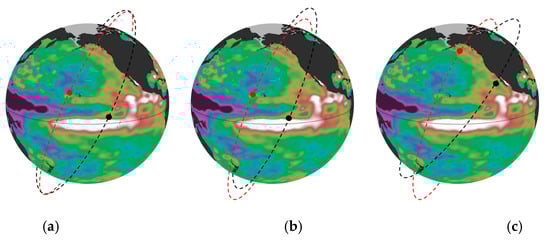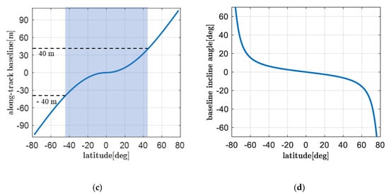Under the helix orbit configuration, the variation cycle of cross-track/along-track baseline length could be adjusted by thrusters at the initial stage, and the cross-track baseline reaches its maximum length while the along-track baseline is about zero at the equator; after that, along-track baseline length starts to increase, and reaches its maximum near the poles. Since ocean surface is randomly changing, OST altimetry near the high latitude region will suffer from worse time decorrelation due to larger along-track separation. Therefore, the optional rotation of the argument of perigee can be adjusted to achieve proper baseline configuration [], as shown in Figure 4c; however, at the same time, the low-latitude region will no longer be suitable for OST altimetry.