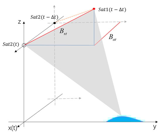 Different from single-platform interferometry, the triangulation of satellite formation is formed by two different time-space planes (except when the satellite formation is at the equator), as shown in Figure 5. At moment, Sat1 is ahead of Sat2, right in the triangulation area (the gray shaded area); after , Sat2 reaches to the same area, therefore the along-track baseline of LB-IRA is inevitable during OST altimetry.