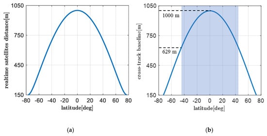 The main objective of LB-IRA from satellite formation is to extend the baseline length, which is essential for improving altimetric accuracy. Different from single-platform interferometry, the baseline formed by satellite formation is flexible without any mast, thus the baseline length is determined by the orbit configuration. In order to obtain a cross-track baseline, a tiny angle is introduced between two orbit planes, as shown in Figure 4a. To provide passive safety in case of a vanishing along-track separation, the suggested safety formation distance should be larger than 150 m, hence a small eccentricity is introduced which yields the radial separation at the poles, as shown in Figure 4b. This type of orbit configuration is referred to as helix orbit by the TSX/TDX team [].