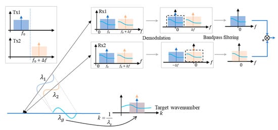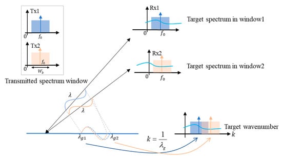 The interferometry of microwave also follows the optical diffraction grating principle from physical optics, therefore, the essential reason for baseline decorrelation is the radar look angle difference, which introduces a relative shift between the target spectrum received by two antennas [,]. The dual antennas in normal interferometry mode transmit pulses of the same carrier frequency and bandwidth, or, in other words, the transmitted spectrum window for target observing is identical, as shown in the upper left corner of Figure 7. The transmitted pulse eventually measures the target in space domain, and the spatial frequency of the target is usually defined as wavenumber, i.e., the reciprocal of the wavelength. Due to the tiny difference of look angle, the transmitted spectrum window will be shifted and stretched after being projected to the wavenumber domain (the stretching effect can be omitted since radar carrier frequency is much higher than signal bandwidth), as shown in the bottom of Figure 7. Only the overlapped region of wavenumber can be used for interferometry, leaving the non-overlapped part to decay to phase noise.