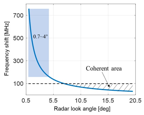 From Equation (13), we learn that enlarging the bandwidth can relatively restrain baseline decorrelation. However, a larger bandwidth leads to lower signal-to-noise ratio (SNR), as well as heavier data transmitting volume, which should be avoided to facilitate extensive OST altimetry. Besides, the cross-track baseline of LB-IRA can extend to 1000 m or even longer and enlarging the signal bandwidth cannot be of much help since the frequency shift is far larger than the signal bandwidth. Figure 8 shows the frequency shift versus radar look angle: the cross-track baseline length is 1000 m in this case. The frequency shift can reach to 180~760 MHz among the angle range of 0.7~4°, which is far bigger than the bandwidth of most of the spaceborne SAR/InSAR. It appears that larger look angle can alleviate the demand for wider bandwidth, however, even if the look angle increases to 20°, the maximum coherence is only 0.69, affected by baseline decorrelation alone, under the 100 MHz of bandwidth setting.