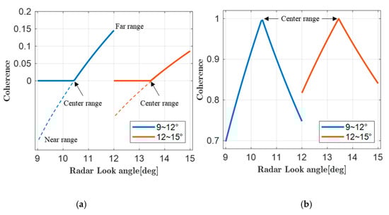 Figure 11a,b shows the coherence before and after CFS compensation, the cross-track baseline length and bandwidth are set to be 1000 m and 40 MHz, respectively. The look angle ranges of 9~12° and 12~15° cover up nearly the same swath width of 50 km, however the CFS variation of 9~12° is larger than that of 12~15°. Before CFS compensation, as shown in Figure 11a, the coherence is zero from the swath center to the near swath since the spectrum has no overlap part due to a smaller look angle. Only a small part of the spectrum overlaps with each other near the far range as the radar look angle increases, due to limited signal bandwidth. After CFS compensation, as shown in Figure 11b, although both of the coherence are high at the swath center (corresponds to center look angle), the coherence of 9~12° decreases more sharply than 12~15° due to larger CFS variation, as indicated by the dashed line in Figure 11a. Apparently, 12~15° is more preferable since the coherence is higher and more consistent among the entire swath.