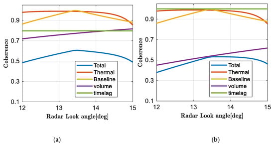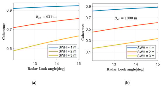 Coherence determined by wave volume decorrelation. (a) Cross-track baseline length of 629 m, and (b) cross-track baseline length of 1000 m.
