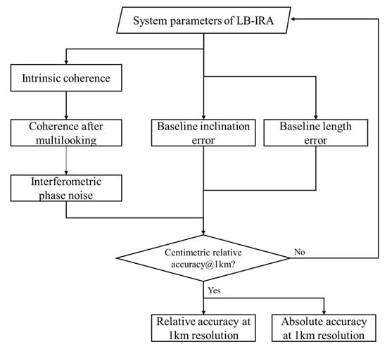 The altimetric error from baseline inclination or length error can only be decreased by longer cross-track, higher radar band, or smaller radar look angle. Therefore, apart from the CFS method, proper system parameters must be selected for LB-IRA. Figure 14 shows the flowchart of the methodology for parameters selection. Since the LB-IRA is mainly focused on geostrophic current or marine gravity anomaly inversion, whether the systems parameters are properly selected is determined if the centimetric relative accuracy is achieved at 1 km resolution.