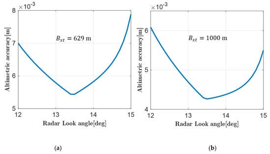 Equation (4) indicates that the altimetric error introduced by baseline length error, , is affected by the baseline length, baseline inclination, altitude, and radar look angle. The selection of altitude and baseline inclination has limited degrees of freedom; therefore, small look angle and large baseline should be set to reduce the altimetric error.