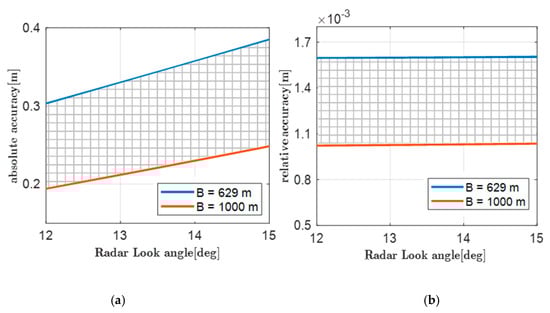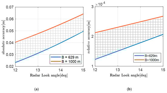 The altimetric accuracy determined by a baseline length error of 1 mm. (a) The absolute accuracy and (b) the relative accuracy.