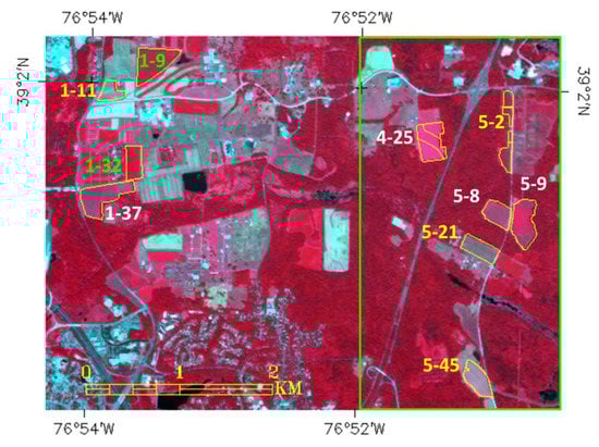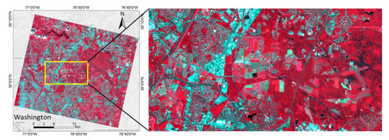 Beltsville Agricultural Research Center (BARC) study site (yellow rectangle and zoom-in figure, northeast suburbs of Washington D.C.). A VENµS false color composite image (Red: near-infrared band; Green: red band; Blue: green band) acquired on 13 July 2019, is overlaid on an Esri ArcGIS online base map.