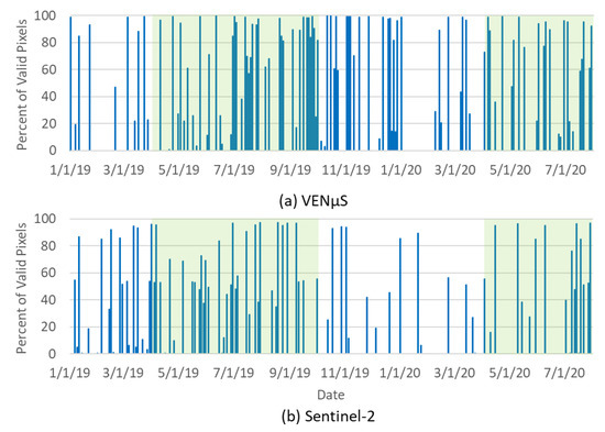 Percent of clear VENµS (a) and Sentinel-2 pixels (b) over BARC in 2019 and 2020. The cover crop termination periods are highlighted in light green.
