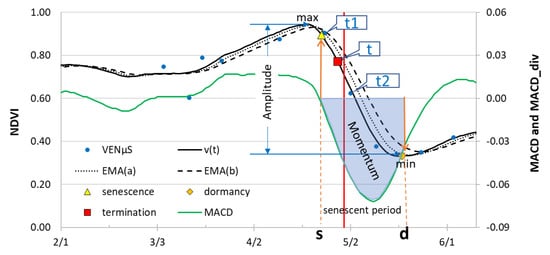 In addition to momentum, we also used the amplitude of the smoothed NDVI time-series (the difference between the maximum and minimum NDVI) over the period of senescence to further confirm a significant downward trend. The search for maximum NDVI included 15 days before the senescence onset since the maximum NDVI may occur prior to onset (see Figure 4). The minimum NDVI was extracted at the dormancy date. In this study, an adjustable threshold for the NDVI amplitude was defined as 0.15. A strong downward trend must be confirmed by the downward momentum of MACD and the amplitude of NDVI during the senescent period.
