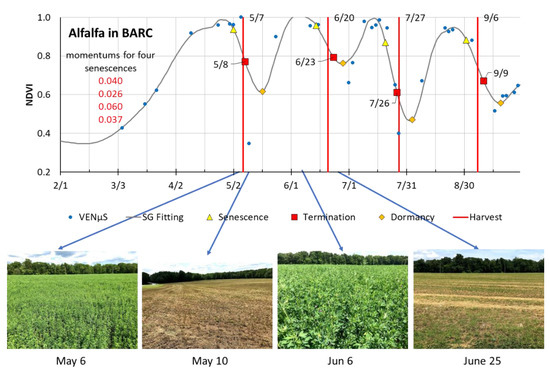 A pixel in the alfalfa field (#5-9) was selected to demonstrate the WIST algorithm. This field was harvested four times during the 2019 growing season, which is a challenging case for traditional remote sensing phenology algorithms. Using the VENµS NDVI time-series, the four termination dates were all detected. As shown in Figure 5, the detected termination dates were all close to the recorded harvest dates. In-field photographs taken before and after harvest clearly showed different conditions in the field. VENµS observations captured the uptrends and the downtrends in the NDVI time-series each time before and after the harvests. The senescence onsets were detected immediately following the peak NDVI dates when the downtrend started. The dormancy dates were close to the dates of the lowest NDVI. The decreasing momentums for four senescent periods ranged from 0.026 to 0.060, well above the threshold value used in the WISE approach (0.010), which means they were all significant downtrends. The uncertainty of the termination estimation ranges from 2–8 days, depending on the number of available cloud-free observations before and after the harvests.