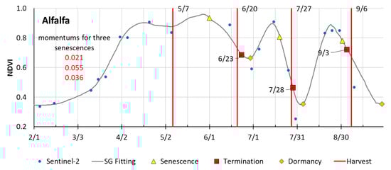Three terminations were detected for the same alfalfa pixel as in Figure 5 (field #5-9) using the 2019. Sentinel-2 time-series. The first harvest on 7 May 2019, was missed since there were no clear Sentinel-2 observations from 7 May 2019 to 14 June 2019.