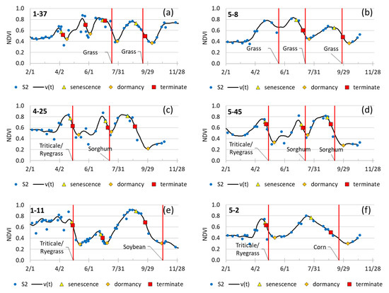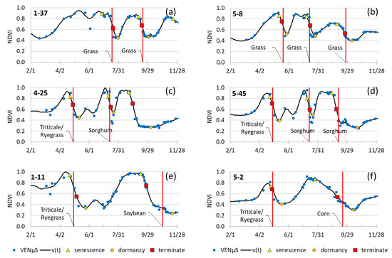 NDVI values in cover crop fields were aggregated at field-level using the defined field polygons in Figure 3. The WIST approach was applied to the cover crop fields using the VENµS NDVI time-series in 2019 and 2020. Figure 7 shows the VENµS NDVI time-series, termination dates (red squares), and the recorded harvest/termination operation dates (vertical red lines) in 2019 for six selected fields. Among the chosen fields, #1-37 (Figure 7a) and #5-8 (Figure 7b) were grasses and were mowed 2 and 3 times, respectively, in 2019. The termination dates were all captured by VENµS. Fields #4-25 (Figure 7c) and #5-45 (Figure 7d) were planted with a triticale and ryegrass cover crop mixture on 4 October 2018, and the crop grew into the 2019 spring. The cover crops were mowed on 29 April 2019, and after that, sorghum was planted. Sorghum in field #5-45 (Figure 7d) was harvested twice on 13 July and 11 September 2019. Both harvests were captured by the WIST approach using the VENµS time-series. The FarmLogic database only has one harvest record for sorghum in field #4-25 (Figure 7c). However, two terminations for sorghum were detected from the VENµS time-series. Compared to field #5-45 (Figure 7d), which had the same cover crop types and same operation dates before the second harvest for sorghum, the second harvest record for sorghum in field #4-25 (Figure 7c) was likely lost in the database. Fields #1-11 (Figure 7e) and #5-2 (Figure 7f) were planted with a cover crop (triticale and ryegrass mixture) in spring and then planted with summer cash crops (corn and soybeans) afterward. The termination dates detected from VENµS agrees with the recorded ryegrass mowing dates well. However, both fields show that remote sensing termination dates for summer crops were earlier than the summer crop harvest dates. This is because the WIST approach assumes the termination happens during the most significant decreasing period. The assumption works better for cover crops when they are terminated while still green. Summer cash crops such as corn and soybeans are harvested after drying down, past the end of the productive stage, when most green leaves have turned yellow or brown. The hypotheses for the WIST approach therefore may not work for summer crops. In Figure 7, actual summer crop harvest dates fell within the senescence onset and dormancy date range but closer to the dormancy date, and after estimated date of termination.