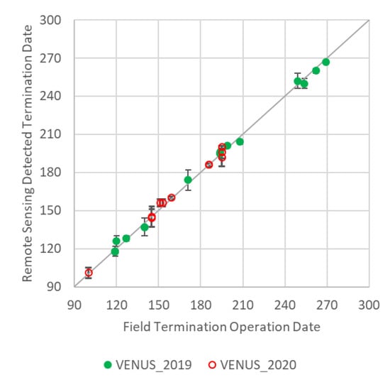 Statistics of termination dates from VENµS and Sentinel-2 over 29 harvest/termination events in 2019–2020.
