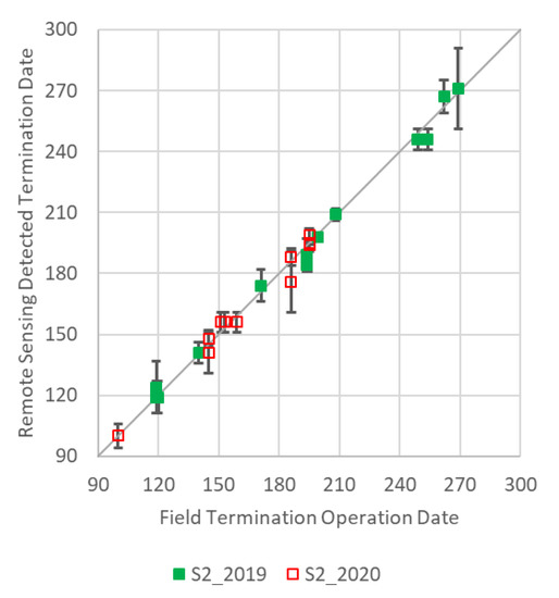Scatter plot of the detected termination dates for fields at the BARC in 2019–2020 using the Sentinel-2 NDVI time-series and the recorded harvest operation dates. The vertical bar shows the uncertainty of the estimated termination date.