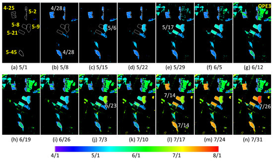 Cover crop termination maps from the 14 weekly near-real-time simulations ((a–n), ending dates below subfigures) using VENµS images. Cover crop field names (yellow text) are shown in (a). Newly detected termination dates from six fields are shown beside the field (white text).