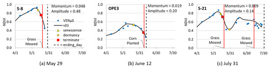 For the first run on 1 May 2019 (Figure 11a), no termination was detected in any field. On 8 May 2019 (Figure 11b), termination dates on 28 April 2019, for fields #4-25, #5-2, and #5-45 were detected. The FarmLogic database recorded the harvest date on 29 April 2019, for the three fields. On 15 May 2019 (Figure 11c), termination for field #5-9 was detected on 6 May 2019. The harvest operation was recorded on 7 May 2019. In the 29 May 2019 simulation (Figure 11e), termination dates were detected on 17 May 2019, for fields #5-8 and #5-21. Both fields were mowed on 20 May 2019, using a discbine machine. The estimated termination of 17 May 2019, was computed using the middle date of two observations on 10 May 2019, and 24 May 2019, as shown in Figure 12a. The lag time could be shortened if the process ran on an earlier date between 25 May and 28 May. In addition to six cover crop fields, the OPE3 (Optimizing Production inputs for Economic and Environmental Enhancement) field in the upper right of Figure 11g shows a termination date on 7 June 2019, a day before the planting date on 8 June 2019. The weeds in this field were killed by herbicide application before planting. It was regarded as a termination since the MACD momentum and NDVI amplitude were significant, as shown in Figure 12b. The simulated near-real-time process ending on 3 July 2019 (Figure 11j), detected a termination date of 23 June 2019, for field #5-9, which was close to the recorded harvest date on 20 June 2019. This was the second termination date in the record for that field, which was planted to alfalfa. The simulation of 17 July 2019 (Figure 11l) detected a new termination date of 14 July 2019, for four fields (#4-25, #5-8, #5-21, and #5-45). There were clear observations on 17 July 2019, and termination dates were detected just 3 days afterward. From the operation records, all four fields were mowed on 13 July 2019. However, field #5-21 shows mixed terminations. Figure 12c illustrates one pixel in field #5-21 (grass) whose termination was not detected, unlike in neighboring pixels, since the downtrend momentum and the amplitude of NDVI were smaller than the specified thresholds. In the last simulation (Figure 11n) ending on 31 July 2019, a termination date of 26 July 2019, was identified for field #5-9 (alfalfa). The recorded termination date was on 27 July 2019. It was the third detected termination date and the third recorded harvest date for this alfalfa field. In the simulation, all harvest events were detected correctly except for fields #5-21 and #5-45, which show some mixed termination dates from the two harvests. For field #5-21, some terminations were not detected, as illustrated in Figure 12c. For field #5-45, false detections were found for some pixels (Figure 11g–k) between two harvests (29 April 2019 and 13 July 2019). A small peak for field #5-45 was also shown in Figure 7d in early June but was not detected as a termination because the downward momentum and the amplitude of NDVI were not substantial at the field level. The lag time of detection ranges from 3–12 days in the weekly simulation process.