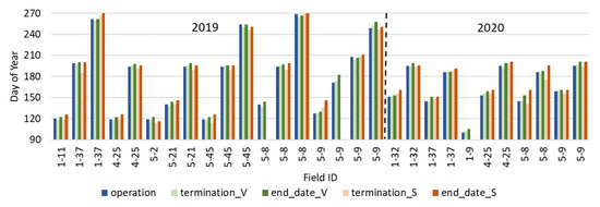 Using imagery from VENµS and Sentinel-2, field-level NDVI time-series were generated for eight fields in 2019 and six fields in 2020 using field boundary polygons, as shown in Figure 3. Termination dates for each field were estimated for both years. The statistics, including mean bias, mean absolute difference (MAD), mean uncertainty, root mean squared error (RMSE), coefficient of determination (R2), missed detections (omissions), and false detections, were computed and compared at the field level using 29 harvest/termination records in 2019–2020.
