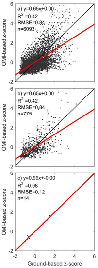 Comparison between z-scores from Ozone Monitoring Instrument (OMI)-based and ground-based tropospheric NO2 concentrations. (a) All annual averages of the ground-based stations against the annual averages of the corresponding OMI pixels. (b) The site-wise average for each ground-based station against the corresponding OMI-based pixels. (c) The annual averages of all ground-based stations against the annual averages of all corresponding OMI-based pixels. Included are also the ordinary least-squares linear regression (red) with corresponding regression equation and coefficient of determination (R2), the root-mean-square errors (RMSE) and the number of data points (n). Slope of the linear regression fit indicates Pearson’s correlation coefficient (R). The black lines are the one-to-one lines.