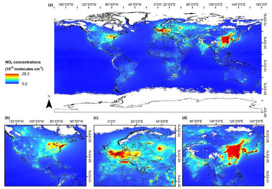Spatial distribution of tropospheric NO2 concentrations (1015 molecules cm−2) averaged over the years 2005–2018: (a) globally; (b) USA; (c) Europe; (d) India, China, Japan. Pixels with less than 50 days of data per year were excluded.