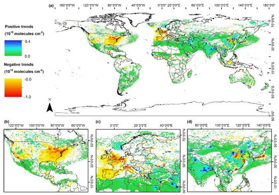 The slope of trend in tropospheric NO2 concentrations obtained by using the annual average tropospheric NO2 concentrations data series, 2005–2018, in PolyTrend: (a) globally; (b) USA; (c) Europe; (d) India, China, Japan. Insignificant no-trends were masked out (α = 0.05).