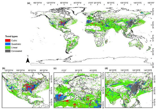 The type of trend in tropospheric NO2 concentrations obtained by using the annual average tropospheric NO2 concentration data series, 2005–2018, in PolyTrend: (a) globally; (b) USA; (c) Europe; (d) India, China, Japan. Insignificant no-trends were masked out (α = 0.05).