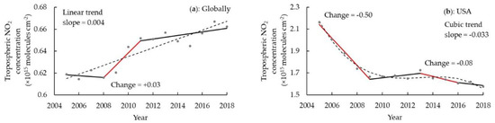Linear regression models assume that changes occur linearly and gradually, which is not always the case [30,49]. Here, a polynomial fitting-based scheme (PolyTrend) was used to account for nonlinear trends. This polynomial approach thus helps to detect nonlinear trends in time-series that would not be identified by an ordinary least-squares (i.e., linear model) approach. The linear trend type was the dominant trend type globally (Figure 4; Table 3) as well as for Europe (except Spain), India and Japan, indicating monotonic (non-decreasing or non-increasing) trends over these areas. The nonlinear trends with a significant slope (quadratic and cubic) were mainly found over eastern parts of USA and Spain. Since the curve of these trends has one (quadratic) or two (cubic) bends, this indicates that the NO2 concentration trends in these areas either started with an increase and then decreased or the opposite started with a decrease and then increased (quadratic), or with even more short-term changes in the direction of the trend (cubic). The latter case is in agreement with the regional trend curve for USA: a cubic trend starting with a short-term downward trend, then an upward trend, and then again another downward trend (Figure 5b). The identified areas with the concealed trends, mainly in the eastern parts of China and south of Spain, are new findings that, up to the best of our knowledge, have not been reported yet. The reason is that the OLS method is often used in trend studies, and such nonlinear trends are not detectable when OLS is applied for the entire studied period. If OLS applies here, no significant trend in 2005–2018 is detected. However, the concealed changes are credible patterns of nonlinear changes such as the greatest breakpoint changes we detected in NO2 concentrations over China.