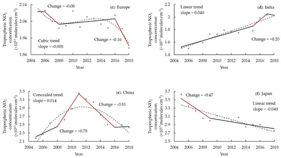 The global tropospheric NO2 concentrations showed a slightly decreasing trend from 2005 to 2008, followed by a small, positive change (0.03 × 1015 molecules cm−2) starting in 2008, and then a gradual increasing trend between 2011 and 2018 (Figure 5a). The annual average reached its highest values towards the end of the period in 2017–2018 (0.66 × 1015 and 0.67 × 1015 molecules cm−2). Among the focus areas, only India showed a similar trend behavior but at a higher NO2 level and with a much greater positive change (0.20 × 1015 molecules cm−2) in 2015 (Figure 5d). Japan was also similar in showing a linear long-term trend with only one breakpoint change but different in that the detected breakpoint was a great negative change (−0.47 × 1015 molecules cm−2), thus resulting in an overall decreasing trend (Figure 5f). In contrast, the number of the greatest changes detected in NO2 concentrations over USA, Europe and China was two. The two greatest changes of USA (−0.50 × 1015 molecules cm−2 and −0.08 × 1015 molecules cm−2) as well as Europe (−0.08 × 1015 molecules cm−2 and −0.16 × 1015 molecules cm−2) were both negative and started either in the beginning (2004–2005) or towards the end of the studied period (2013–2016) (Figure 5b,c). The first greatest change detected over China was positive (0.78 × 1015 molecules cm−2) and started in 2008, but then a second big reverse change (−0.81 × 1015 molecules cm−2) happened in 2011 (Figure 5e). These two almost equally big but opposite changes (upward and then downward) with no relax time in between caused the overall NO2 trend being insignificant with no net-change in NO2 concentrations throughout the time period over China. This type of significant nonlinear trend was identified as concealed trend type (Figure 5e).