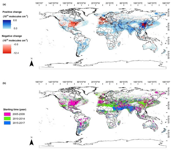The breakpoint with greatest change in tropospheric NO2 concentrations obtained by using the annual average tropospheric NO2 concentration data series, 2005–2018, in Detecting Breakpoints and Estimating Segments in Trend (DBEST). (a) Magnitude of the change. (b) Starting time of the change.