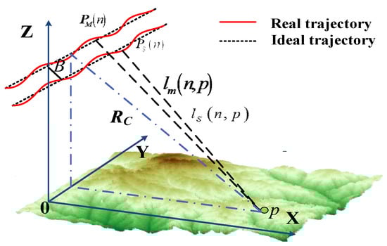 where denotes the coordinate of the InSAR platform obtained by the GPS and IMU of the radar system, , is the instantaneous velocity of radar platform, and for 2D imaging; is the coordinate corresponding to the target point on the imaging plane.