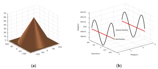 To compare the performance of the proposed algorithm with several classical imaging algorithms, the simulation data are processed by imaging algorithms based on TDBPA, FDBPA, RDA, and FFBPA, respectively. The main simulation parameters of InSAR are shown in Table 1. The original simulation scene is a cone with the size of . The reflection coefficient of each target point in the simulation scene is different from another according to its distance from the antenna and the unique incident angle. Figure 2a shows the simulation cone scene model. Antenna jitter is added in the trajectory and the actual trajectory is shown in Figure 2b.