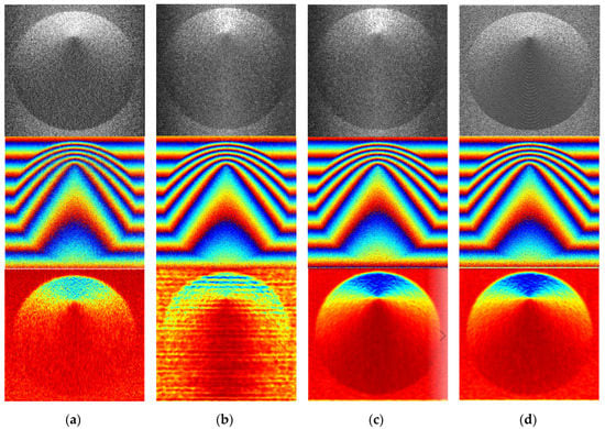 The results of experiments: (a) 2000 × 2000, (b) 4000 × 4000, (c) 5000 × 5000, and (d) 7000 × 7000. (Top: amplitude. Bottom: interferogram.).