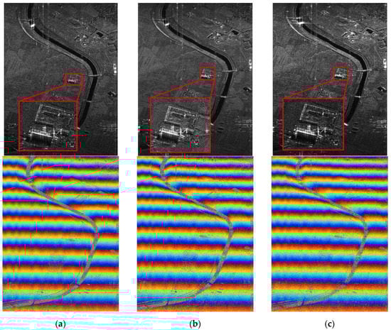 InSAR imaging results of the airborne large scene. (a) TDBP, coherence (COH): 0.812, time: 8805.70 s; (b) RD, COH: 0.802, time: 37.28 s; and (c) FDBP, COH: 0.809, time: 1102.4 s (top: amplitude, and bottom: interferogram).