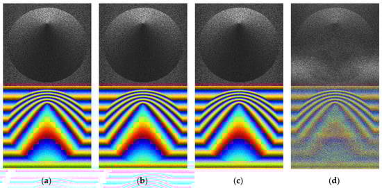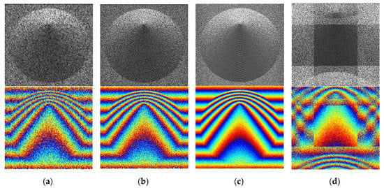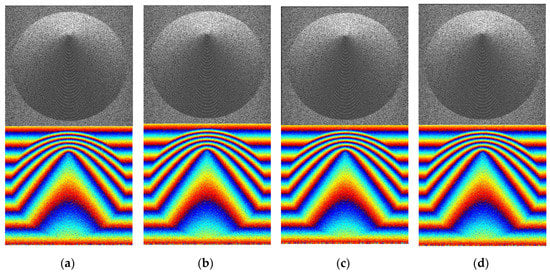 The results of the simulated cone: (a) 1000 × 1000, (b) 2000 × 2000, (c) 4000 × 4000, and (d) 6000 × 6000. (Top: amplitude. Bottom: interferogram.).
