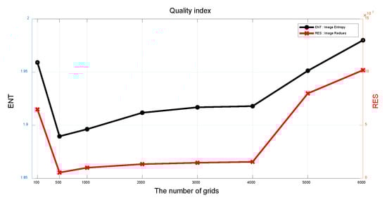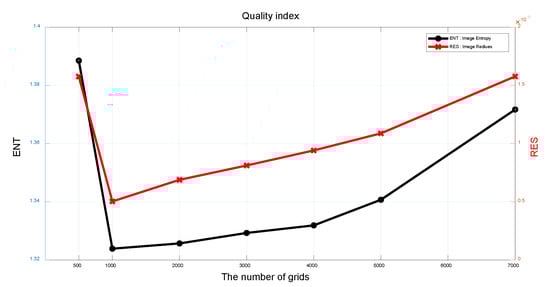 The results of measured data in Figure 9 and Figure 10, and Table 7 confirm the validity of the above conclusions. Figure 9 is the imaging results and Table 7 gives the quality indicators of images in Figure 9. Figure 10 shows the quality indicators of more control groups. Patently, the effect on image quality is minimal when the number of grids varies within a reasonable range. When the number of grids increases to , obvious noise points appear in the amplitude image, and the interferogram quality falls. Furthermore, the indicators show the best performance when the grid is which is calculated by grid division formulas with system parameters.