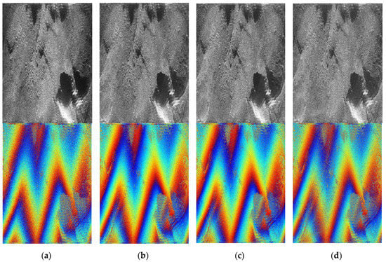 Figure 11 is the results of the simulation data and shows the amplitude and interferometric images of the target scene. As can be seen from it that with the increase of grid interval, the target scene size increases, the details of the target scene get richer and the interference fringes in the interferograms become clearer. The main characters of the cone in Figure 11a,b, and Figure 11c are well restored and the interferometric fringes are distinct. The reduction of the proportion of the target scene in the focusing image causes the reduction of the resolution of the target scene, which also leads to the loss of the detail information of the restored images in Figure 11a,b. As shown in Figure 11d, when the grid interval exceeds , the target scene exceeds the scope of the focused image, resulting in image aliasing and image focusing failure.