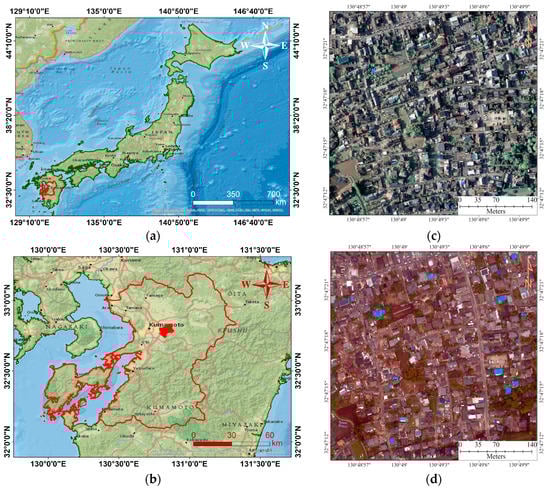 The general location of the study area: (a) Japan, (b) location map, (c) orthophoto of the study sites before the mainshock, and (d) orthophoto of the study sites after the mainshock.