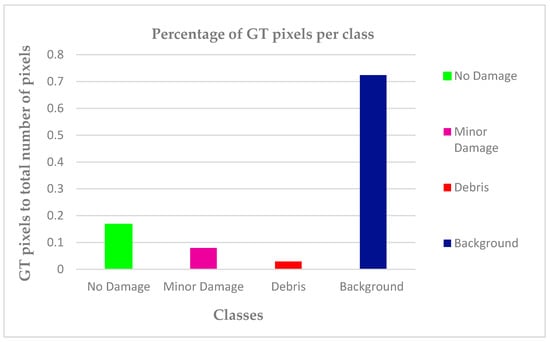 Figure 2 shows the percentage of ground truth (GT) dataset pixels for each class. The percentages of GT pixels showed a tolerance of 2.91% as the minimum (debris class) to a supreme of 72.35% (in the background class). The number of GT pixels for the minor damage class was about 7.96%. The percentages for the no damage showed a value of 16.78% (twofold more than the minor damage). This was done to ensure that these GTs were representative of the whole classes. For example, the backgrounds of the images were more than the other classes, so a well-conducted classification would try to maintain this ratio in the GT sample. The details for the GT data are shown in Table 2.