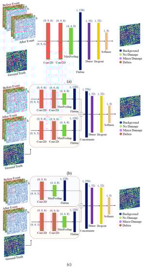 Regarding the composite model, before and after the earthquake, orthophotos are assembled to form an image with six bands. Thereafter, a network of CNN with two 2D convolution layers and eight filters with a 3 × 3 window size are imployed. The quantity of filters needs to be set to a maximum of eight to avoid overfitting in training [21]. The size of the window needs to be greater than the smallest size of an intermediate output (i.e., building) [16]. The outcomes of the convolution then transited to a ReLU prior to down-sampling by a max pooling layer.