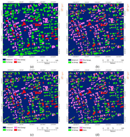 This paper evaluates orthophoto data for the detection of earthquake-induced damaged buildings through three CNNs models: composite, twin, and fusion. The damaged maps were classified into four classes, namely background, debris, minor damage, and no damage. It was found that background can be identified precisely from the three models. However, minor damage is classified with the lowest accuracy in all three models. Figure 6p–r shows an example of when a building (red square) is mostly misclassified by all the models as background instead of minor damage. The misclassification might relate to the nature of triple-band orthophotos and their resolutions. Overall, although some degrees of misclassification still exists among the classes, the applicability of the adopted frameworks exhibited satisfactory performances in detecting multi-class damages.