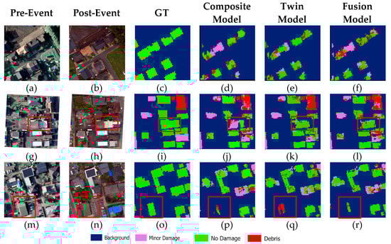 Overall classification results: (a,g,m) pre-event, (b,h,n) post-event, (c,i,o) GT, (d,j,p) composite model, (e,k,q) twin model, and (f,l,r) fusion model.