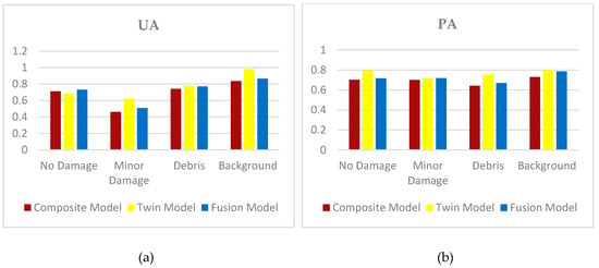 Figure 7 shows a comparison between the accuracy achieved using the UA and PA in each class. The higher accuracy is achieved using a twin model in the no damage and background classes, and the lowest one is achieved in the debris class using the composite model.