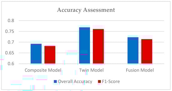 The models were executed using Python 3.7.4 on the platform of Intel(R) Xeon(R) W-2125 CPU @ 4.00GHz Core-i7 system with 32 GB RAM. The performance evaluation of the three models is presented in Table 4. The OA was recorded at 69.24%, 72.27%, and 76.86% when the composite, fusion, and twin models were applied, respectively. The OA appeared to increase by about 3.03% when considering the fusion model instead of the composite model. In addition, the OA was enhanced by about 4.59% when considering a CNN using the twin model instead of the fusion model. In general, the OA appeared to increase from 69.24% to 76.86% when considering a CNN using the twin model.