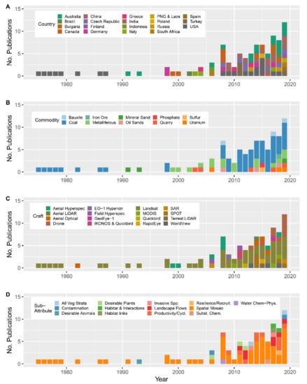 We eliminated a significant number of remote sensing papers that did not directly focus on rehabilitation. For example, many papers assessed the direct impacts of mining on land cover, using change detection at regional scales (e.g., [37,38]), while other studies showed a greater emphasis on soil assessments [39,40,41].